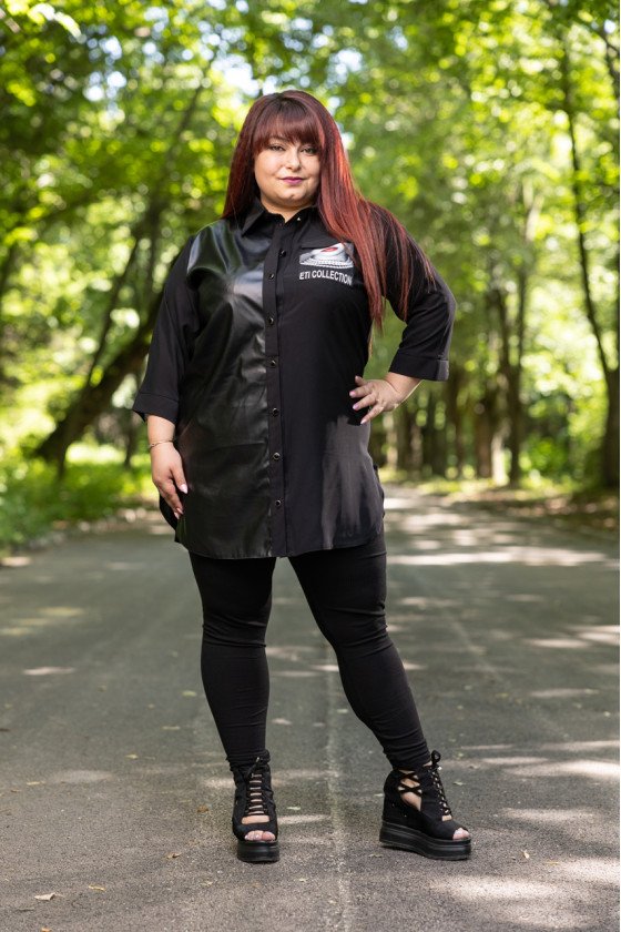 Тази дамска риза от ETI Collection комбинира две текстури за максимален визуален ефект – гладка, гланцирана еко кожа и матов полиестер. Асиметричното разположение на кожата отпред създава изтънчена визия, която привлича вниманието, а свободната кройка добавя комфорт и движение.