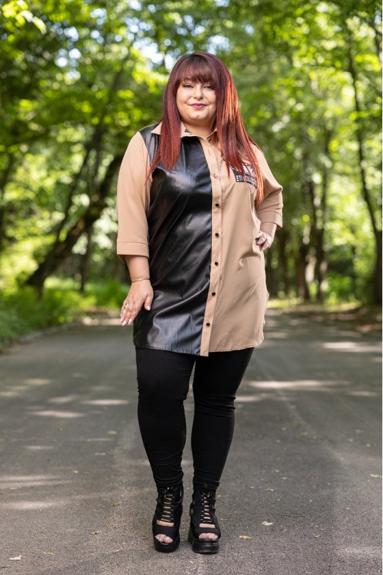 Тази дамска риза от ETI Collection комбинира две текстури за максимален визуален ефект – гладка, гланцирана еко кожа и матов полиестер. Асиметричното разположение на кожата отпред създава изтънчена визия, която привлича вниманието, а свободната кройка добавя комфорт и движение.