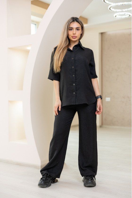 Стилен ленен комплект широк крачол в черно